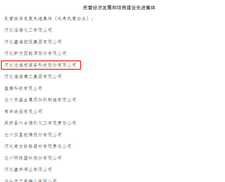 近日,河北滄海核裝備科技股份有限公司榮膺“2022年度滄州市民營經濟發(fā)展優(yōu) 秀企業(yè)”榮譽稱號,董事長趙德清獲民營經濟發(fā)展先 進個人稱號。